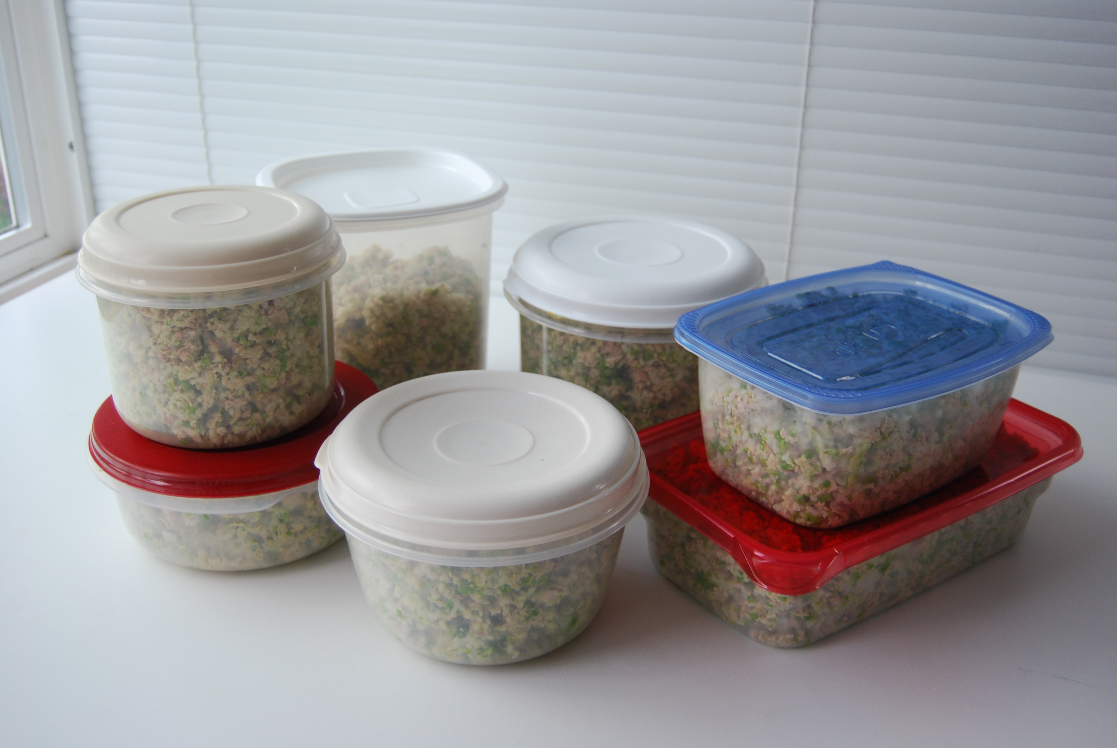 Our girls eat twice a day (7:30 a.m. and 6:00 p.m SHARP!) For each meal, they each get 1/2 C. of the homemade food. CeeCee also gets no-salt-added canned green beans.